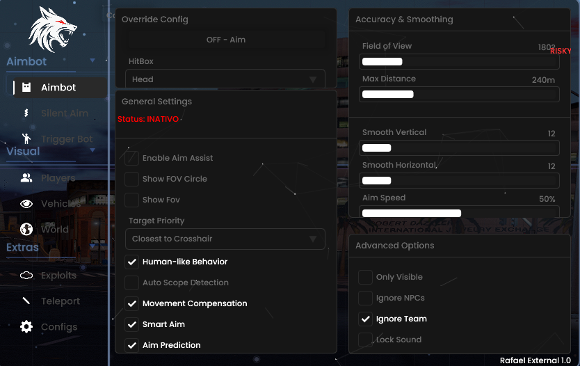 Rafael External 1.0 Aimbot com Aim Prediction, ESP completo (Players, Veículos, Mundo), Teleport, Exploits e mais. Comportamento humano, smooth aim, FOV ajustável e proteção contra ban. 100% funcional em servidores RP e PvP